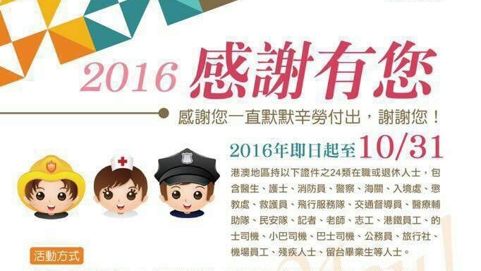 各地旅遊業搶客,又到台灣出招。台灣觀光局由即日起至10月31日,推出「2016感謝有您」推廣活動,吸引更多港澳人士遊台。港澳地區持有效證件之24類在職或退休人士,包括醫生、護士、紀律部隊人員、記者、甚至港鐵員工、公共交通工具司機等等,可獲一晚免費住宿。計劃詳情可參考Facebook專頁。
