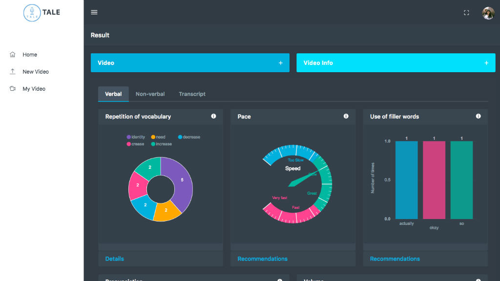 Tale團隊介紹,香港學生雖然常要接觸英語,但英語作為第二語言,學生對英語演說的信心與練習機會都不足,而學校又難以逐個學生個別照顧,因此他們開發一個方案,用戶上傳英語演說的影片至雲端,軟件會以人工智能分析演說表現,統計發音準確性、用字等情況,指出毛病及建議,並為用戶推薦影片示範等學習資源。