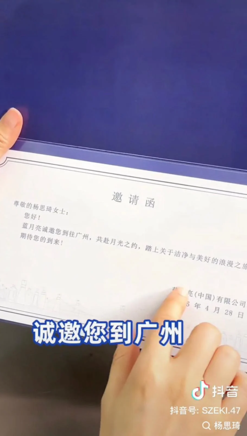 楊思琦近日於抖音分享短片,片中她透露獲上市集團品牌藍月亮邀請,往廣州為多款洗衣潔淨產品做直播帶貨,拿著邀請卡的思琦表現興奮兼說:「不是吧,我做夢了哇!」其後說要為工作好好作準備。